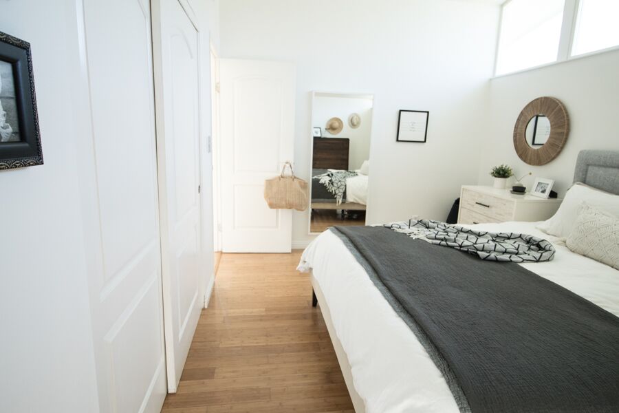 Right now it’s pretty much a blank canvas. White walls, not much artwork, we’ve already removed the closet doors. I love the windows but I have considered extending the wall treatment up to include a bit of covering for them. Still brainstorming that one. I want to change the feel of the room drastically so toning down some of the light from the clear story windows may be the option.