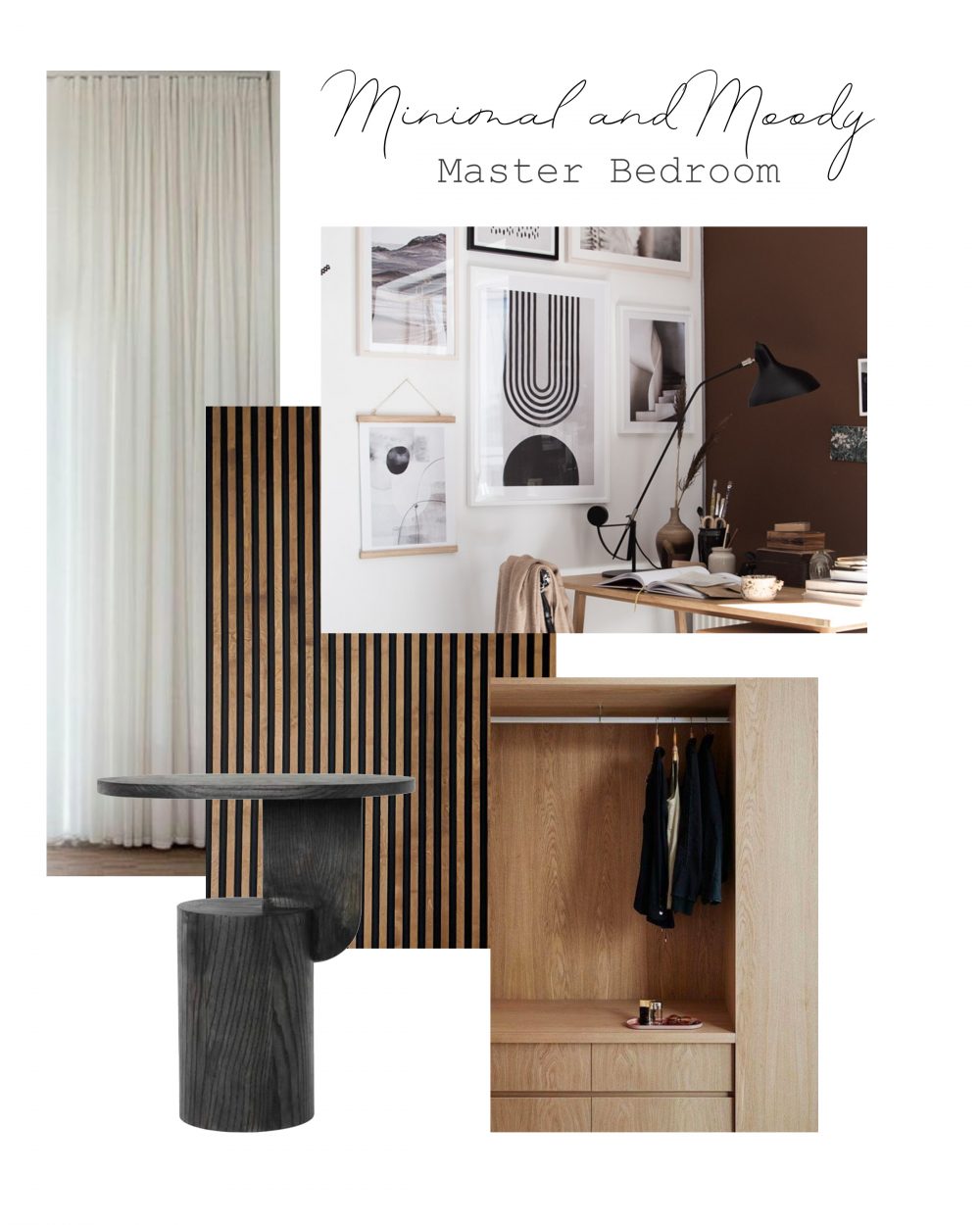 The room I chose is our master bedroom. It seems to always be the neglected room of the house. Our second and last baby has officially been in his own room for a couple months so there is no longer a bassinet or changing table in our bedroom and it’s time to give it a refresh. My plan is to go for a moody but still minimal vibe. I love the look of low lit rooms that create some mood and drama. Since I like to keep most of the house light and bright, this will be a good room to experiment with. I’m hoping to play around with deep wood tones, high contrast, minimal furniture and an eclectic and artistic feel with the artwork and decor. This will be a big pivot from the light and brightness of the room now.