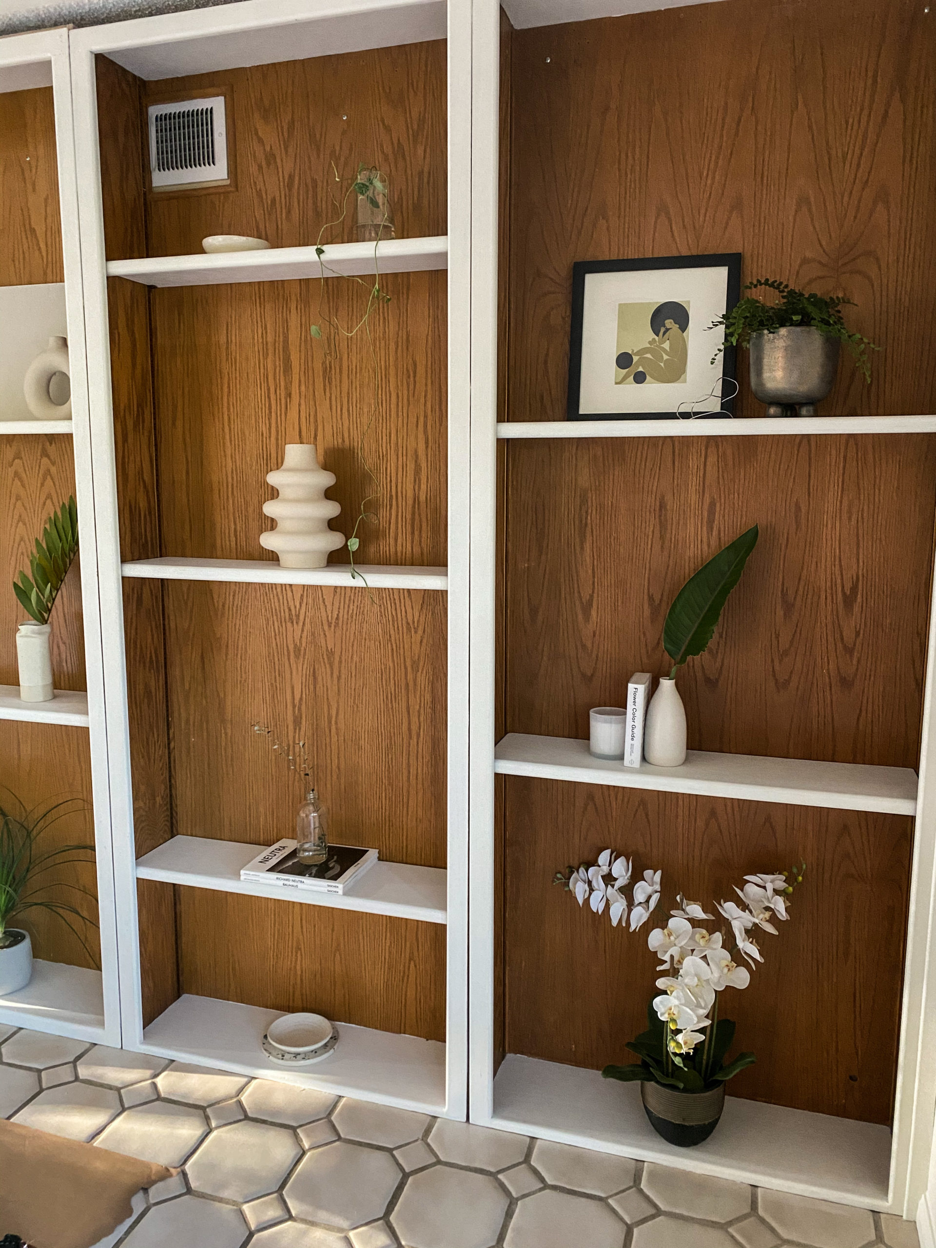 When we bought this house a month back I saw the bookshelves as a styling opportunity but knew I wanted them to feel less dated, orange, and busy.