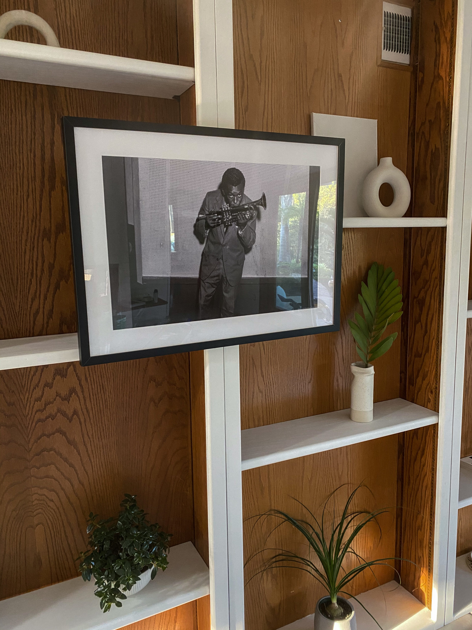 This Miles Davis print is a surprise to my husband as this room houses the wet bar, a fireplace and a record player. He’s already picturing the chill hangouts. He is a huge fan of Jazz and and when I came across this print I knew it would be a good fit. I prob would have went with a white frame next time but the black gives another nice contrast.