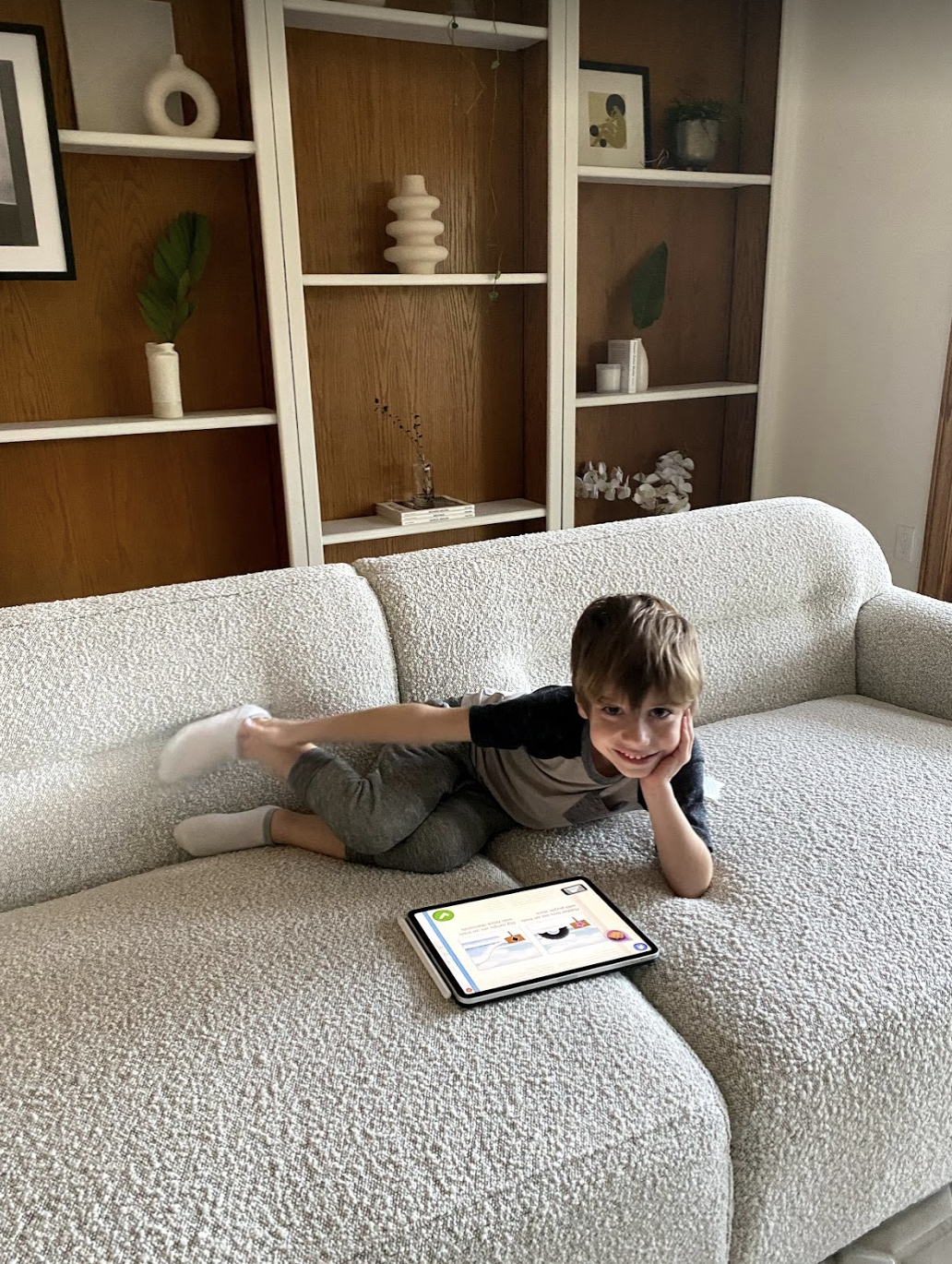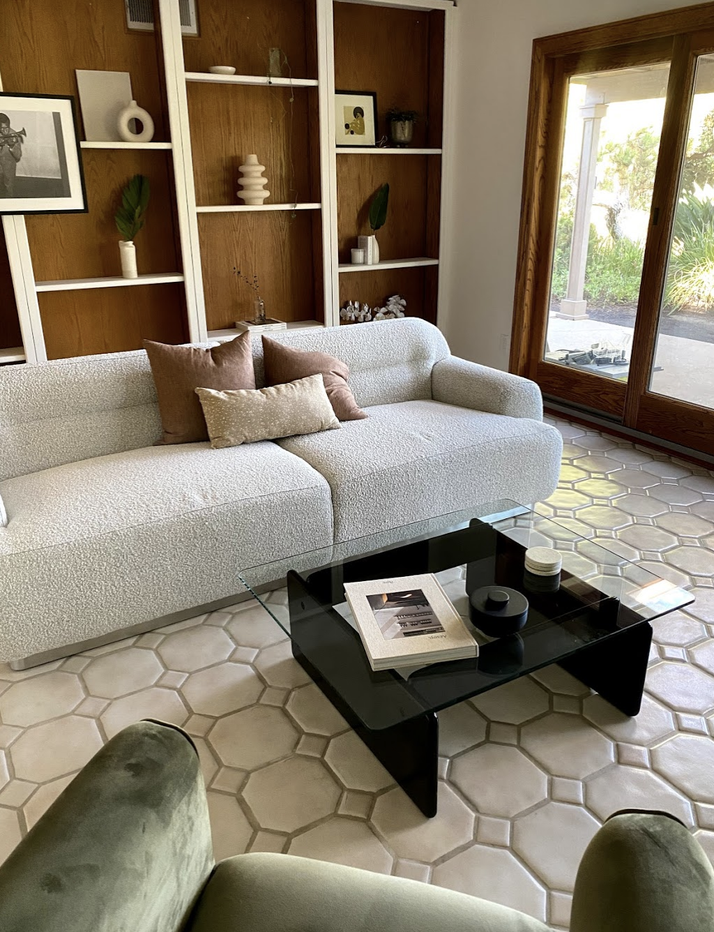 I know you are dying to know if it is as good in person. I read every review before taking the plunge to purchase this one. Sofas are challenging to order online because you just never know what you will get as far as comfort. As far as fabric goes, the boucle is great quality. So soft and beautiful in person. Very similar feel to the Gwyneth Boucle chair which I have and love. I don’t know what it is about boucle but it photographs so beautifully. The color of the Logan Sofa is very much white with specs of grey and maybe leans towards a cooler tone as it has the chrome base. The comfort is firm but cozy. It is a deep sofa which I am used to now as our previous one is the same dimensions. You either love or hate deep sofas. I actually prefer standard but this one has a nice lounge to it. My 5 year old loves it as you can see. I pile pillows on it when I want more support and upright comfort. It is definitely a statement piece and I’m very happy with how it looks in the room. I think it looks better backed to a wall as the backside is very straight and looks a bit off floating in the center of the room but it works and very few people notice those details.