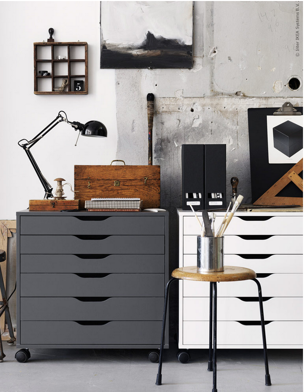 I have always loved the map style cabinets with skinny print drawers. I feel like every artist studio needs one. These style drawers will come in handy to house some prints and paper as well as my collection of paints and pens. I am a big fan of IKEA cabinets but they have been out of stock of the Alex slim art cabinets I want with no plans to restock so I may have to get resourceful on that one. I do have a friend who is a cabinet maker and is encouraging me to make my own. We shall see how that one turns out.